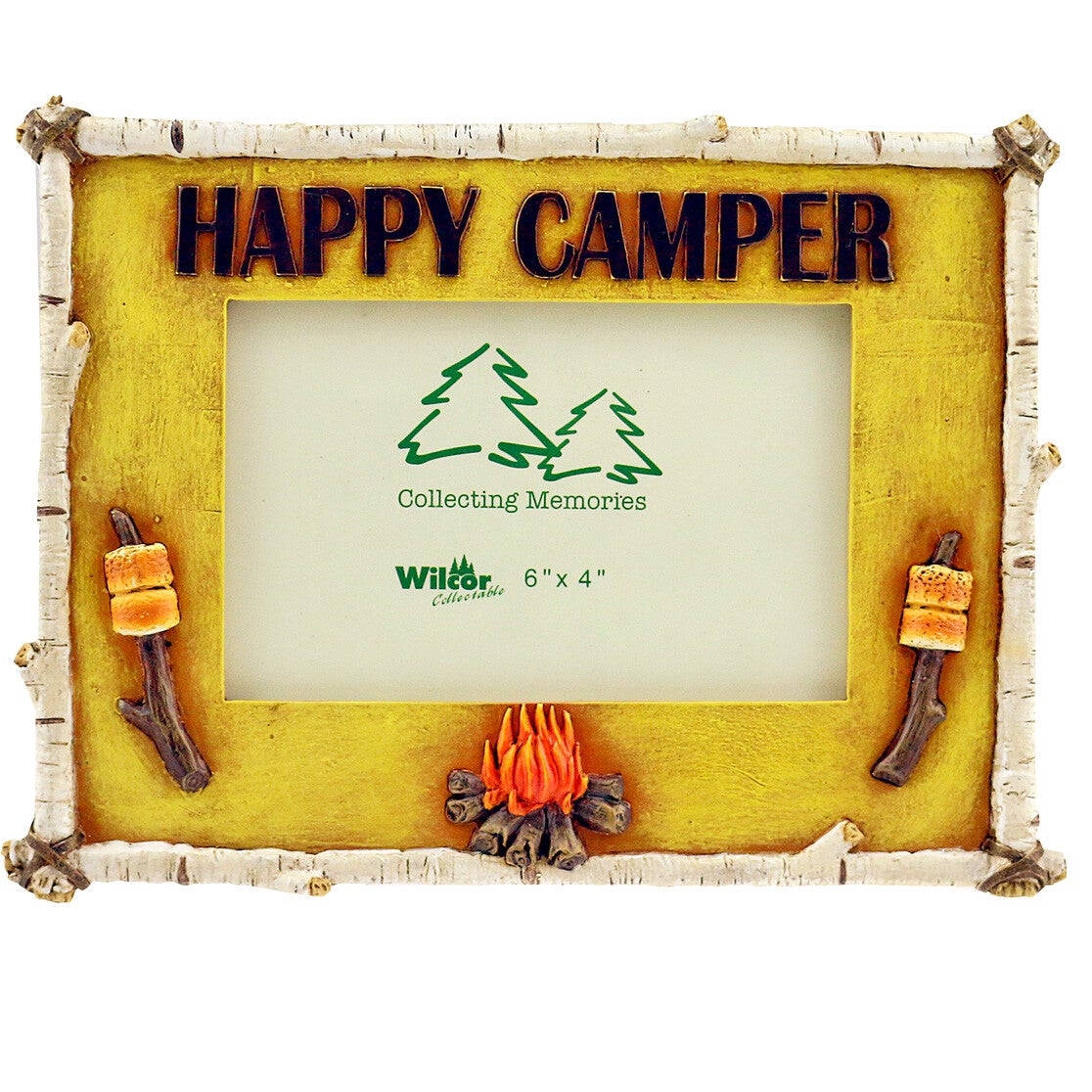 Happy camper frame holds a 4" x 6" photo and features a campfire and marshmallows ready for toasting. Polyresin, 9.5" x 7".